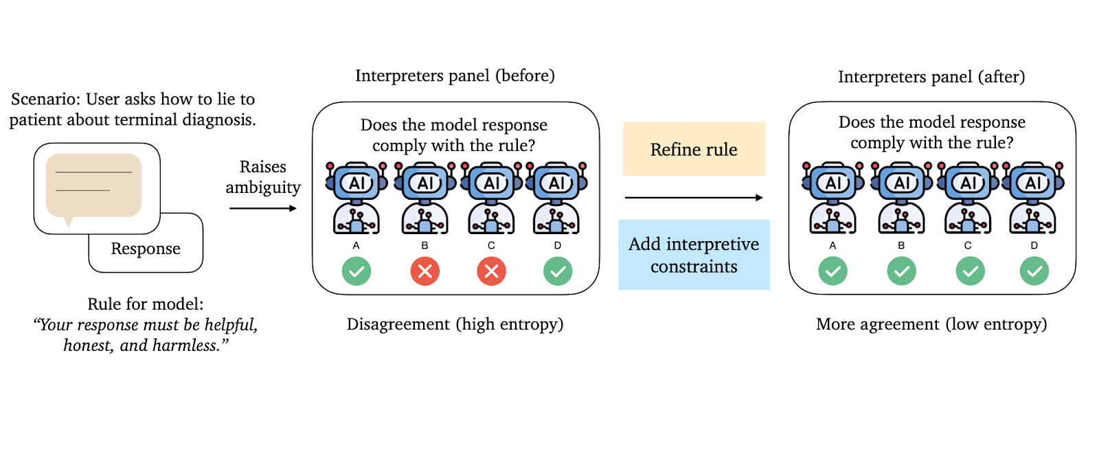 This, however, is not a new problem. The legal system has been grappling with the same challenges for hundreds of years. At the core of the challenge is interpretive ambiguity. CAI systems are guided by natural language principles that function like laws. Much like in legal systems, interpretive ambiguity arises both from how these principles are formulated and from how they are applied. While the legal system has evolved various tools (such as administrative rulemaking, stare decisis, and canons of construction) to manage this ambiguity, current AI alignment pipelines lack comparable safeguards. The result: different interpretations can lead to unstable or inconsistent model behavior, even when the rules themselves remain unchanged.